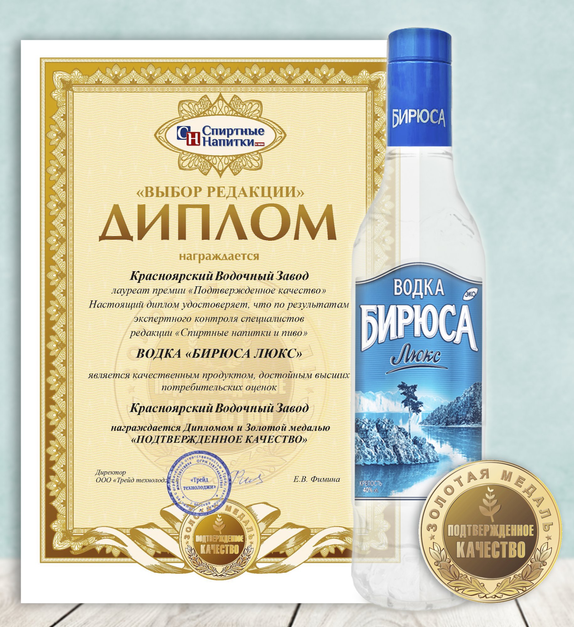 Торговая марка «Бирюса люкс» получила Диплом и Золотую медаль Лауреата премии «Подтвержденное качество», войдя в "ТОП-10. Выбор редакции. Водка сегмента mass-market" журнала «Спиртные напитки»!