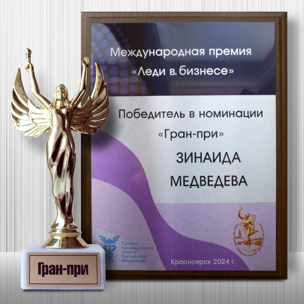 Генеральный директор Красноярского Водочного Завода, МЕДВЕДЕВА ЗИНАИДА ИВАНОВНА была удостоена гран-при конкурса в первой Международной премии «Леди в бизнесе».