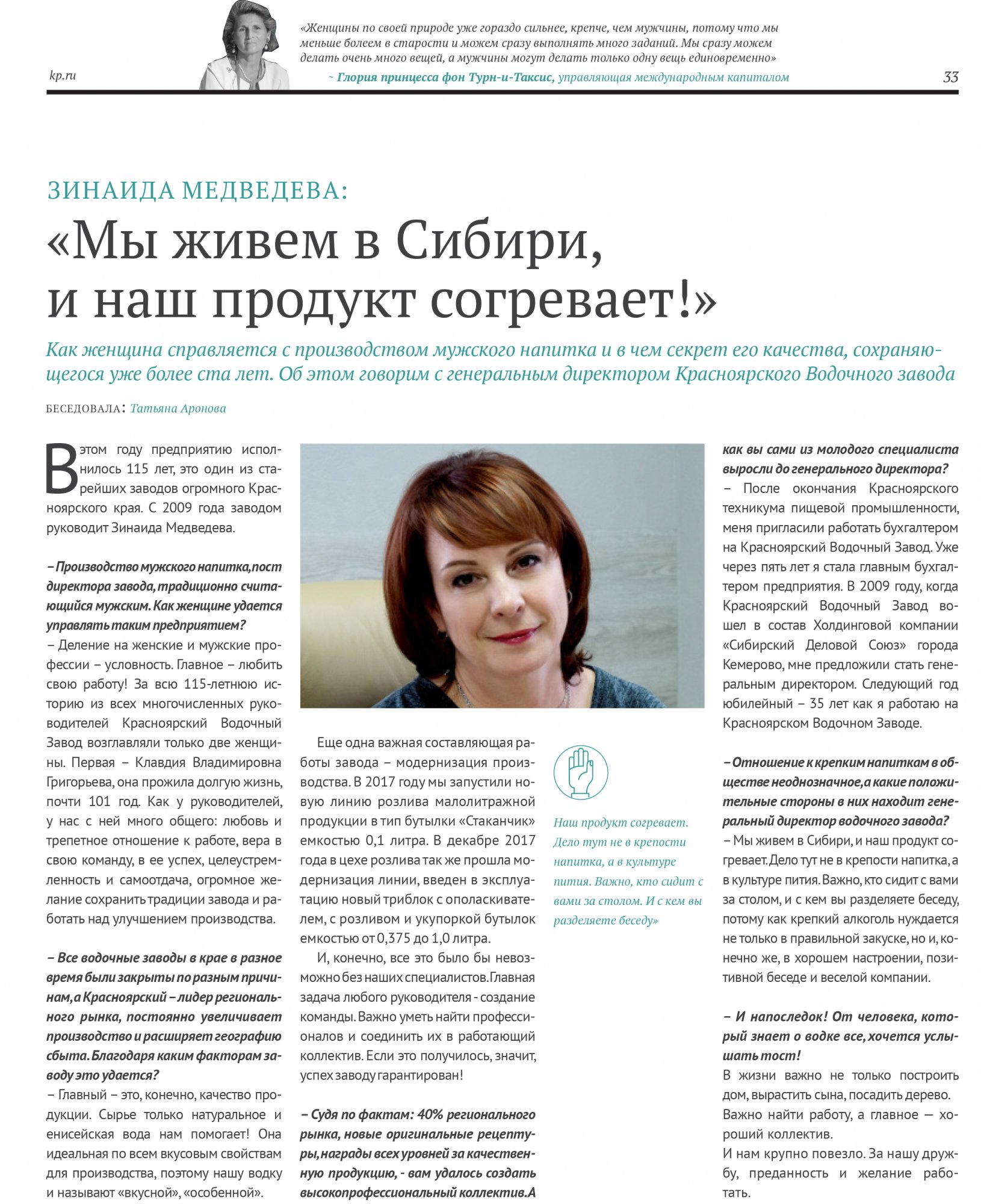Директор Красноярского Водочного Завода Зинаида Медведева: «Мы живем в Сибири, и наш продукт согревает!»