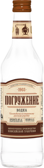 Водка «Погружение» - результат успешного сочетания старинной русской рецептуры, сибирских традиций купажа и современных технологий производства. Водка «Погружение» - это уникальный по своему качеству и вкусу напиток, в рецептуре которого ничего лишнего: только высококачественный зерновой спирт «Люкс» и уникальная мягкая Енисейская вода. Продукт для настоящих гурманов, любителей русской водки.