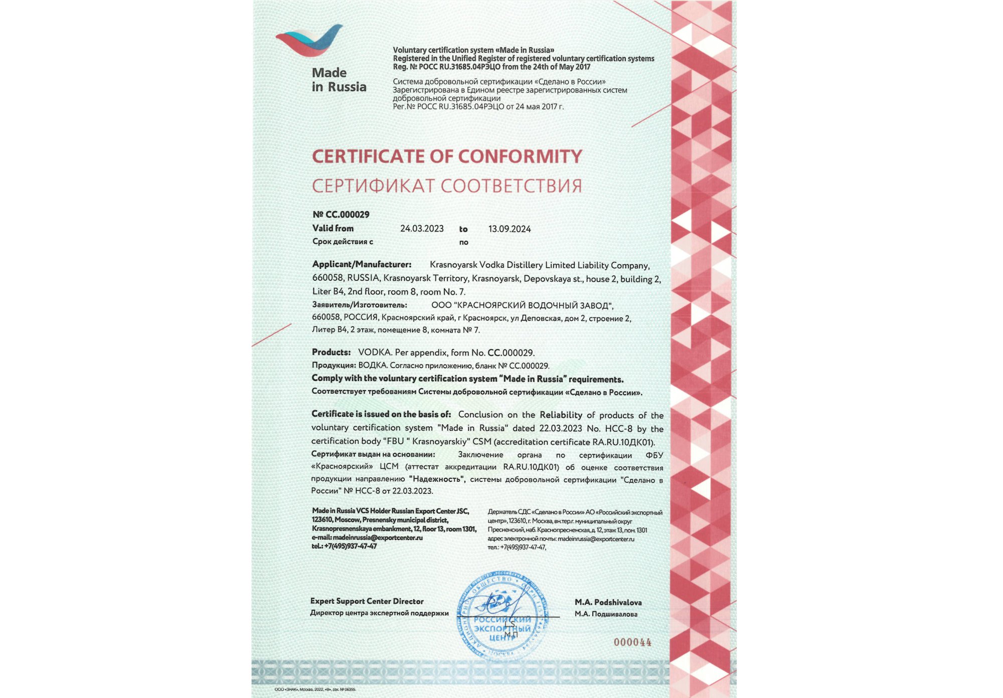 ООО «Красноярский Водочный Завод» получил сертификат соответствия от Системы добровольной сертификации «Сделано в России»!
