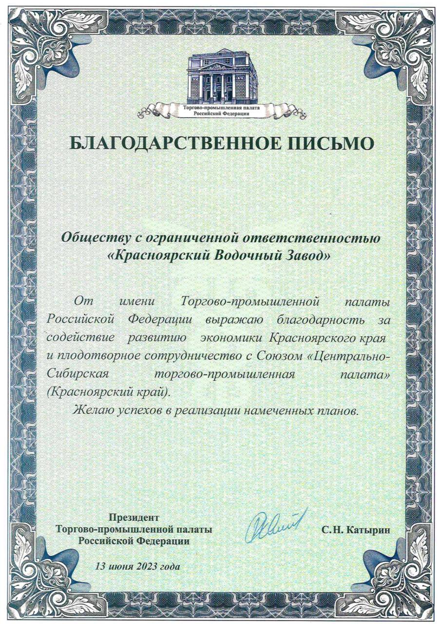 Президент Торгово-Промышленной палаты Российской Федерации Сергей Николаевич Катырин объявил благодарность Красноярскому Водочному Заводу за содействие в развитии экономики Красноярского края.