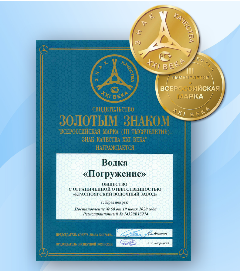 Водка «Погружение» - результат успешного сочетания старинной русской рецептуры, сибирских традиций купажа и современных технологий производства. Водка «Погружение» - это уникальный по своему качеству и вкусу напиток, в рецептуре которого ничего лишнего: только высококачественный зерновой спирт «Люкс» и уникальная мягкая Енисейская вода. Продукт для настоящих гурманов, любителей русской водки.